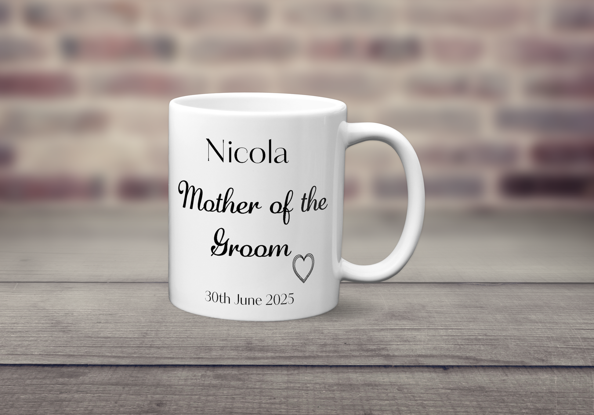 Celebrate the love and support of the Mother of the Groom with this beautifully personalised mug. Customise it with her name and the wedding date to create a heartfelt keepsake she'll treasure forever.